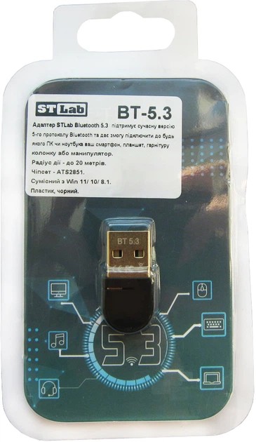 Bluetooth-адаптер STLab BT-5.3 Black — це сучасний компактний пристрій на базі високопродуктивного чипсета ATS2851, що забезпечує підтримку останнього протоколу Bluetooth 5.3. Адаптер дозволяє одночасно підключати до 5 пристроїв, таких як миші, клавіатури, геймпади та акустику, гарантуючи вдвічі більшу швидкість та вчетверо ширший діапазон роботи порівняно з попередніми версіями. Завдяки технології Bluetooth Low Energy, аксесуар суттєво знижує енергоспоживання периферійних пристроїв.