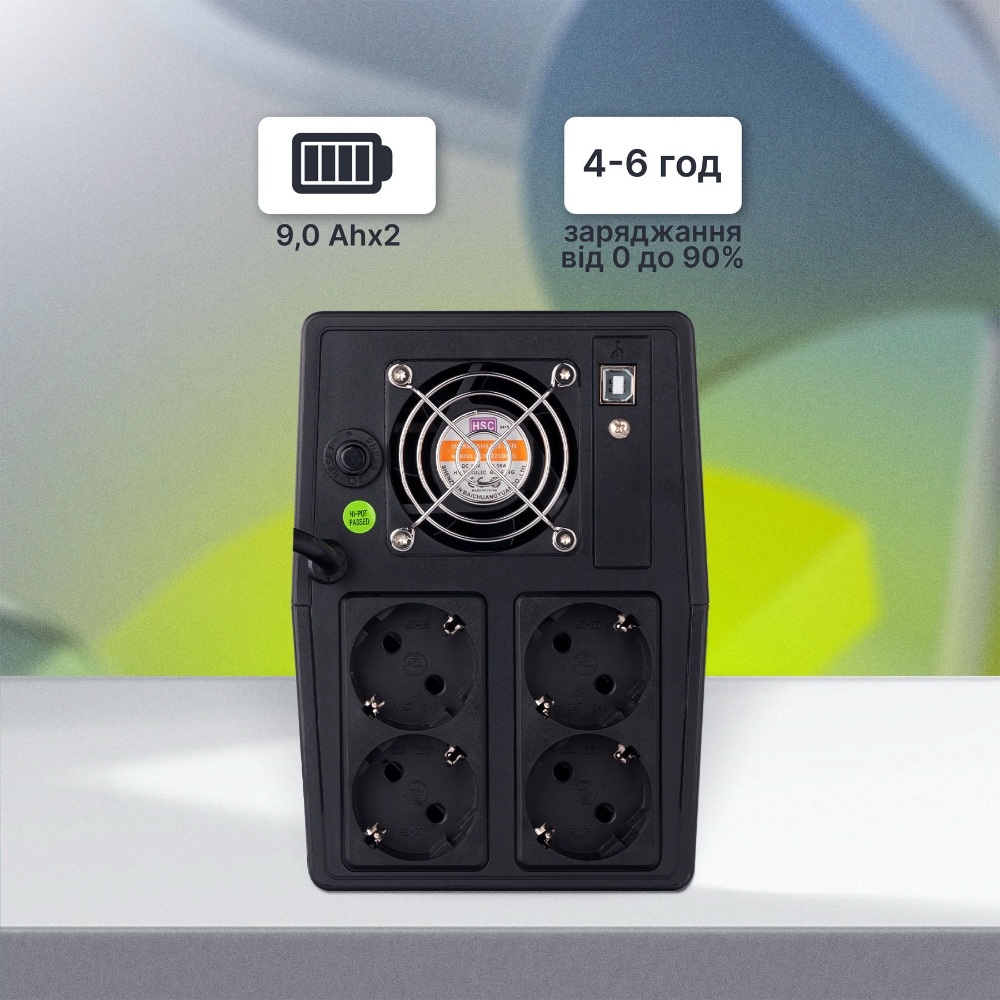 Корпус ДБЖ виконаний з якісного пластику та оснащений чотирма розетками типу Schuko, розташованими зверху для зручного доступу. Модель підтримує інтелектуальні системи захисту від перевантаження, короткого замикання та глибокого розряду батареї. Наявність порту USB Type-B дозволяє здійснювати моніторинг параметрів живлення через комп’ютер, а компактні габарити роблять його зручним для розміщення в робочій зоні.