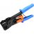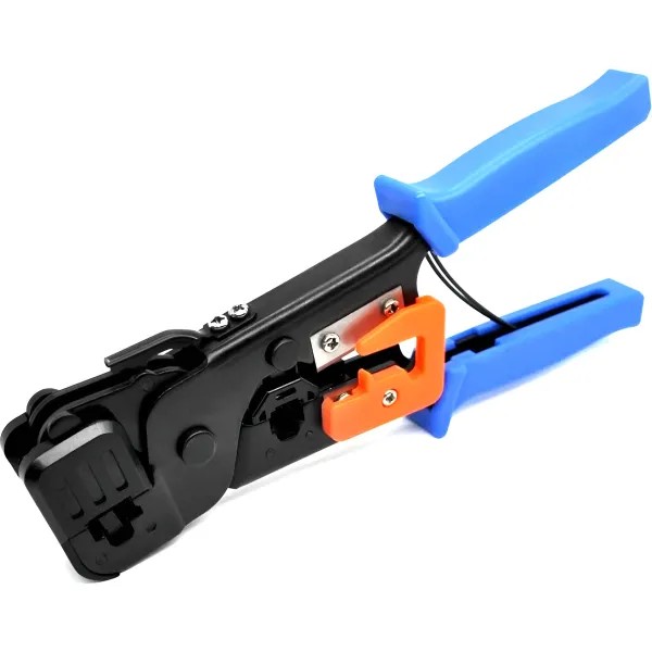Корпус інструмента виготовлений із міцних матеріалів і оснащений синіми нековзними рукоятками, що забезпечують впевнений хват під час роботи. Наявність фіксатора закритого положення дозволяє компактно та безпечно зберігати крімпер у сумці з інструментами або кишені. Механізм забезпечує рівномірне зусилля притискання, що гарантує надійний контакт провідників із конектором і стабільну передачу сигналу в мережі.