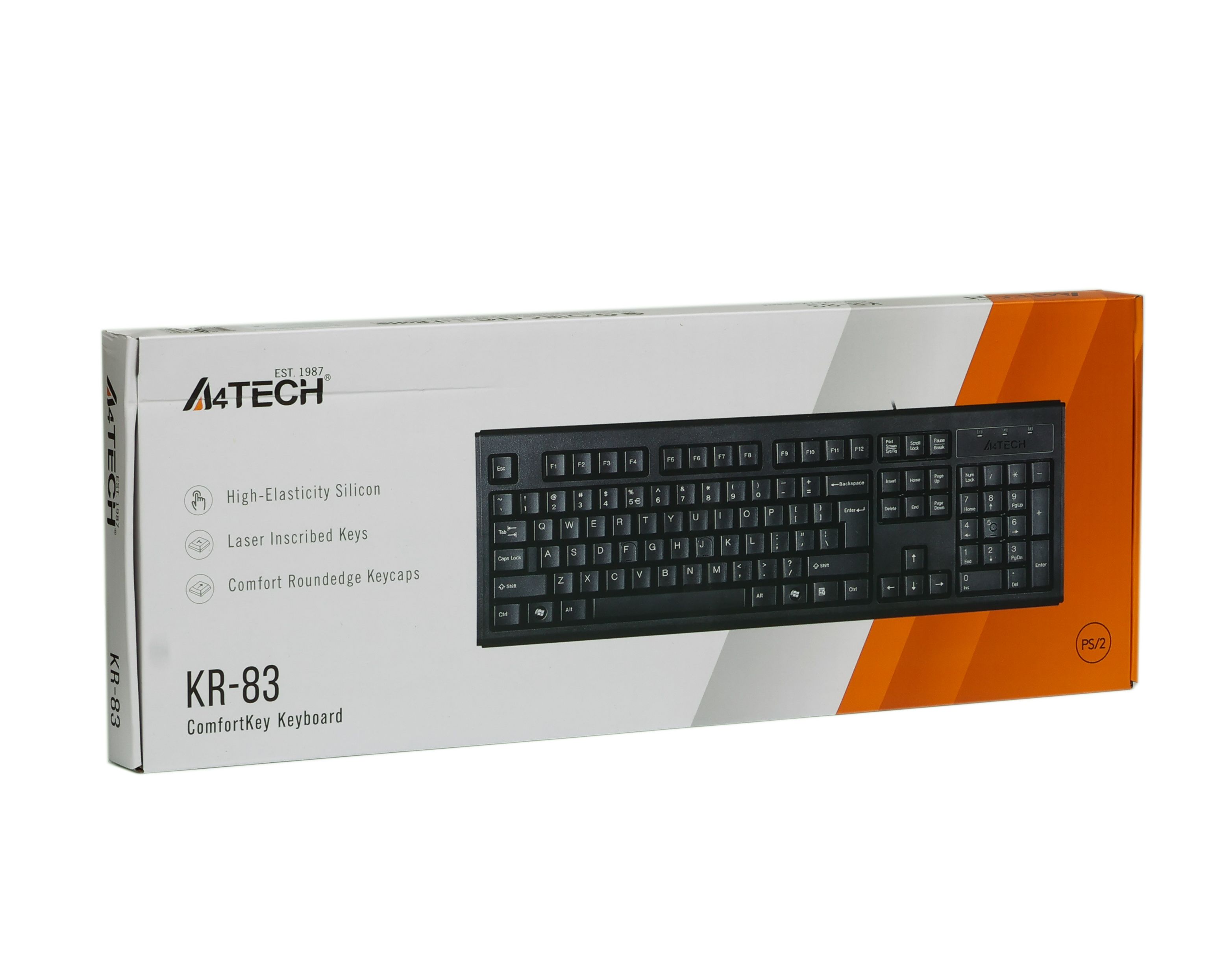 Клавіатура дротова A4Tech KR‑83 PS/2 виконана в класичному форм‑факторі з PS/2‑інтерфейсом, що робить її сумісною зі старішими комп’ютерними системами та серверами. Модель має стандартну розкладку клавіш з функціональними клавішами, цифровим блоком і зручним розташуванням, забезпечуючи комфортний набір тексту та базову роботу з офісними програмами.