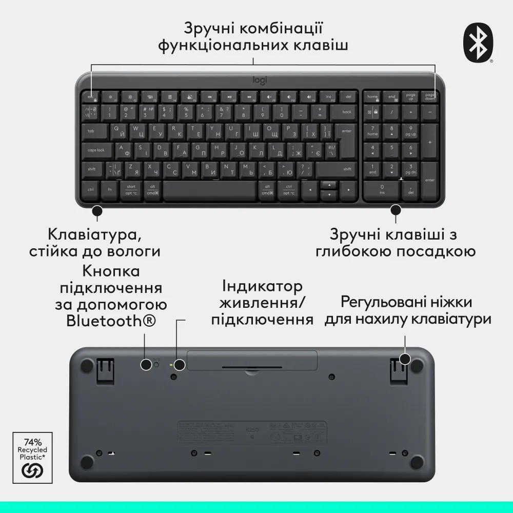 Це комплект бездротової клавіатури та миші Logitech MK250 Bluetooth, який забезпечує просте підключення через Bluetooth® Low Energy без необхідності USB‑приймача, звільняючи порти для інших пристроїв. Клавіатура має повнорозмірну мембранну розкладку з цифровим блоком (109 клавіш) для комфортного введення тексту, а миша оснащена оптичним сенсором з роздільною здатністю до 1000 DPI та трьома кнопками для базових дій.