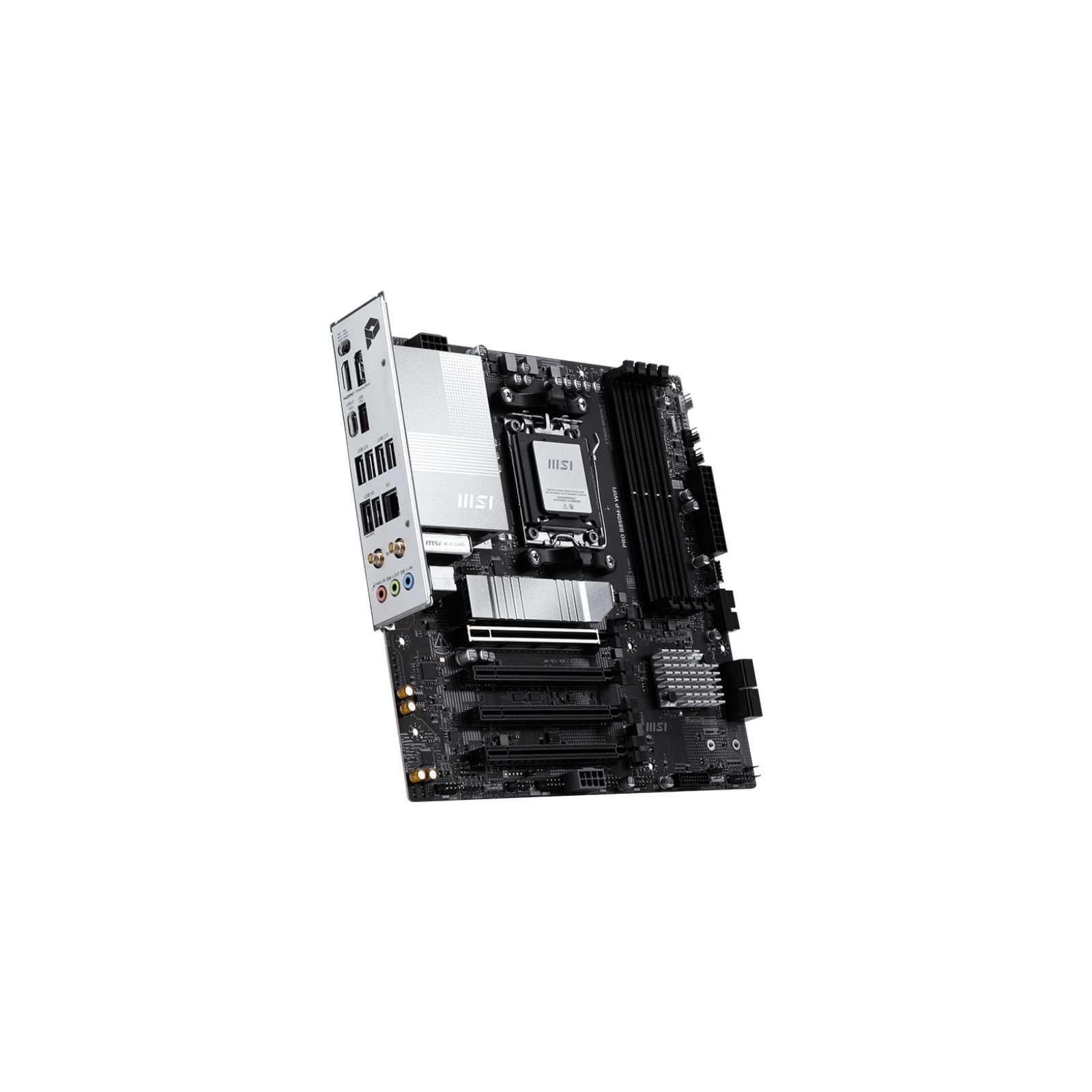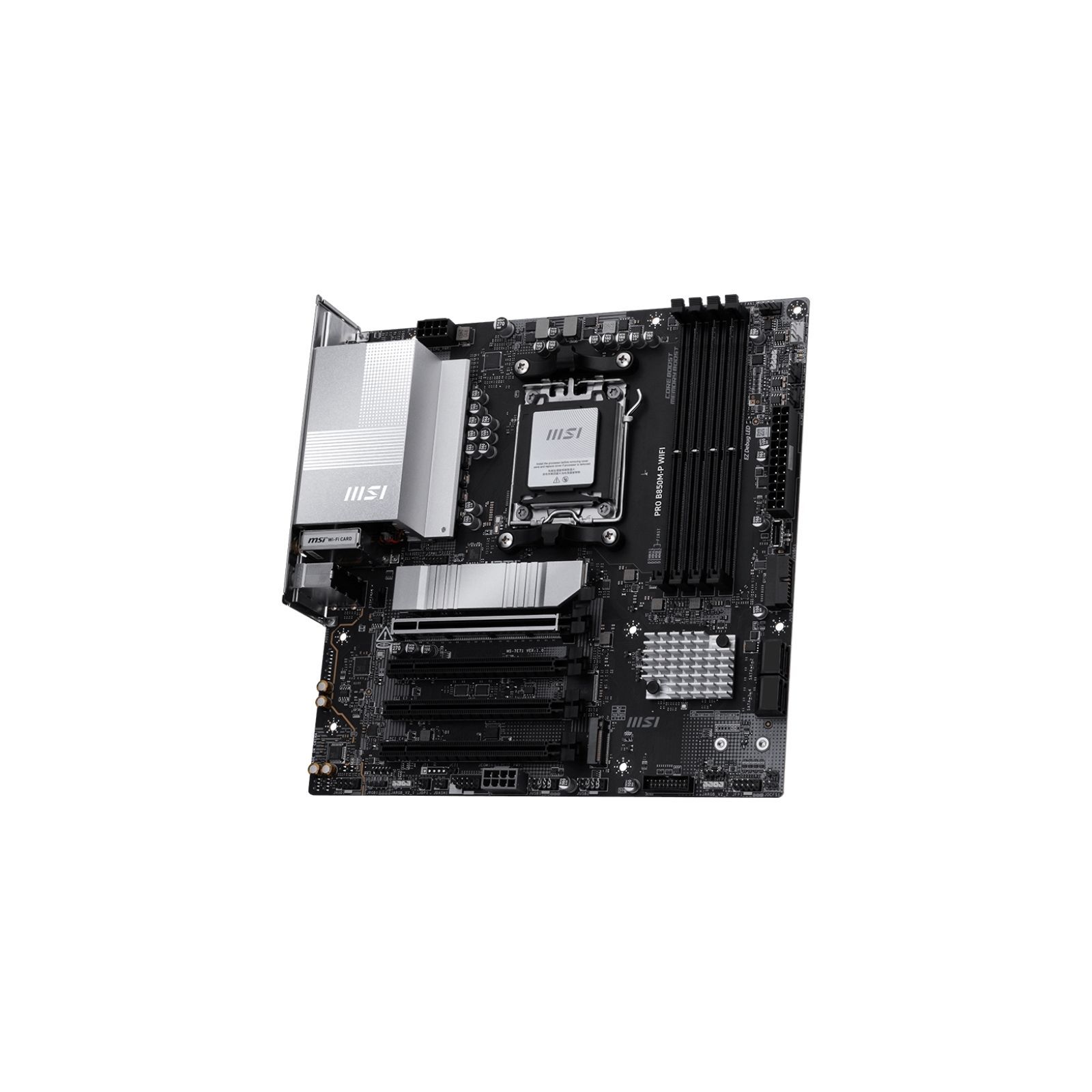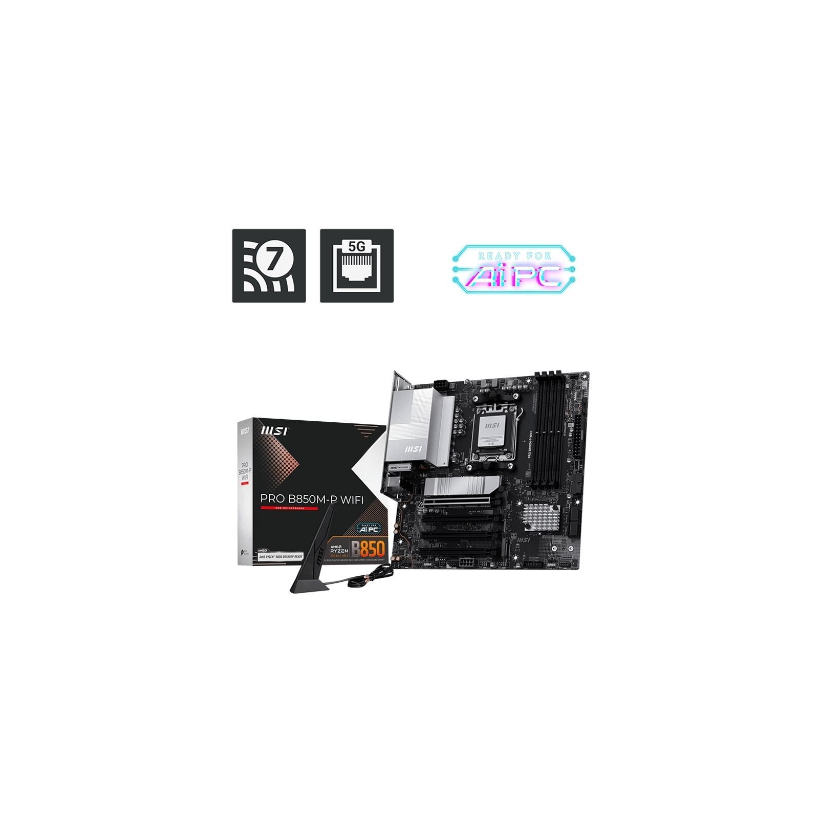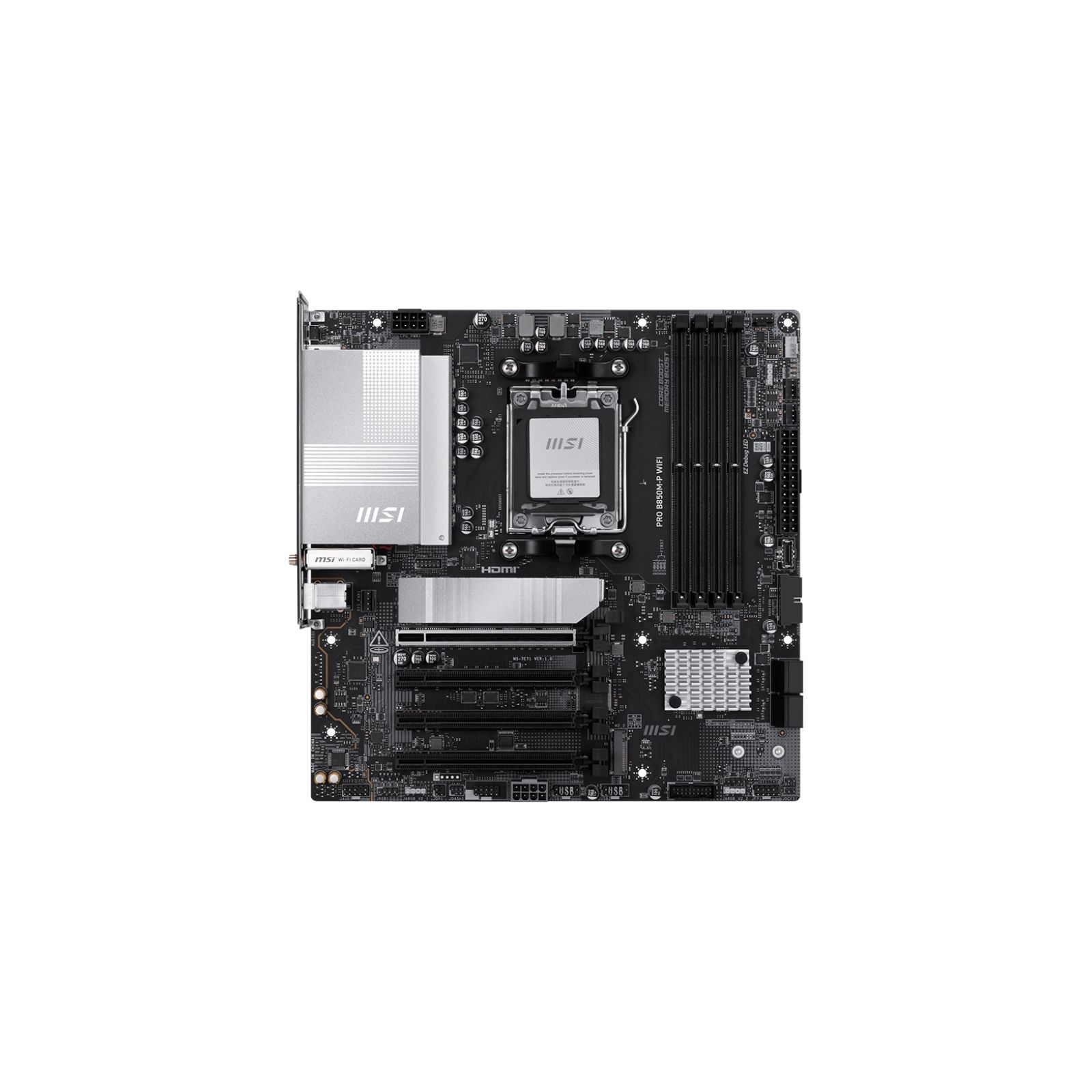 Материнська плата MSI PRO B850M-P WIFI виконана у форм-факторі Micro-ATX та побудована на чипсеті AMD B850 з роз’ємом AM5, підтримуючи процесори AMD Ryzen 7000 / 8000 / 9000 серій. Плата оснащена 4 слотами DDR5 з підтримкою до 256 ГБ пам’яті та частот до 8200 МГц (OC), а також має 3 слоти M.2, 4 порти SATA 6 Гбіт/с і підтримку RAID 0/1 для швидких та надійних сховищ.