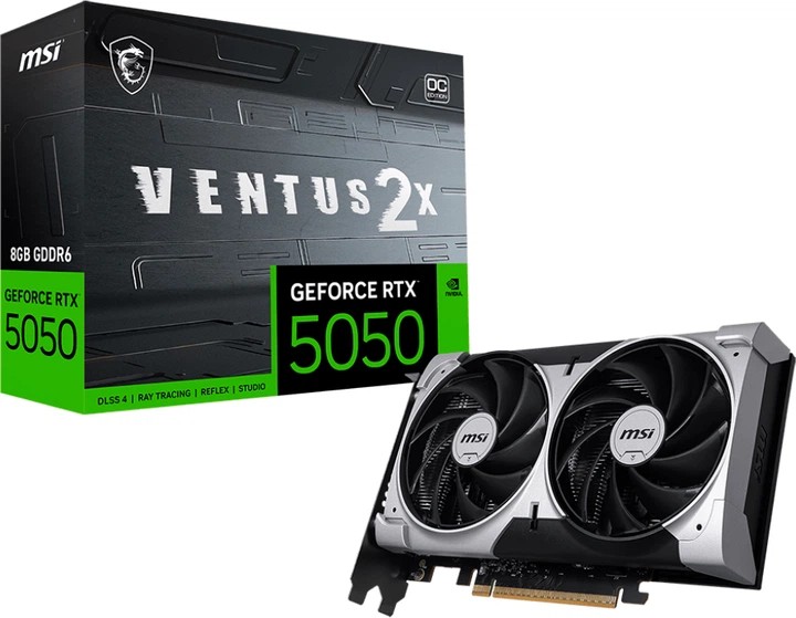 Відеокарта MSI GeForce RTX 5050 8GB GDDR6 VENTUS 2X OC побудована на архітектурі NVIDIA Blackwell та оснащена 2560 CUDA-ядрами, що забезпечує високу продуктивність у сучасних іграх і творчих застосунках. Вона має 8 ГБ пам’яті GDDR6 з 128-бітною шиною та ефективною швидкістю 20 Гб/с, підтримує PCI Express 5.0 і здатна працювати з роздільною здатністю до 8K. Підтримка DLSS 4, трасування променів і NVIDIA Reflex 2 робить карту актуальною для нових ігрових проєктів та роботи з графікою.